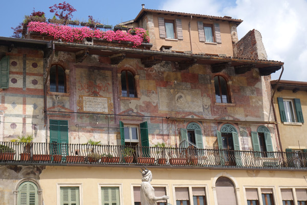 Sonnabend wurde Verona besichtigt. Es gibt eine Reihe beeindruckender Kirchen, attraktive Geschäfte und natürlich den Balkon von Julia, vor dem sich die Touristen drängeln. Die Mauern des Durchgangs zum kleinen Hof sind mit tausenden Schichten von Herzen mit Namen und Daten bemalt. Den Abend verbrachten wir auf einem Weingut.