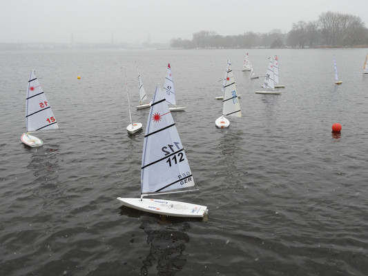 Echte Segelboote waren nicht zu sehen, da die Alster im Winter 'bootsfrei' sein muss. Die Segler des NRV, die es auch in der kalten Jahreszeit nicht ohne Boote aushalten, trafen sich an diesem Sonntag mit ihren ferngelenkten Segelbooten und trugen eine Spaßregatta unter Leitung des langjährigen NRV Regattaleiters 'Triple H' aus.