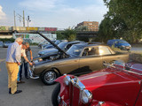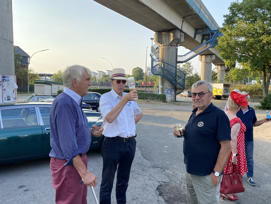SB Rudolf E. hatte nicht nur ein gutes Essen bestellt, sondern bat mit fröhlich launischer, aber seinem Namen entsprechender 'ernst'-hafter Ankündigung zum Concours d'Elegance. Das schönste/interessanteste Auto sollte auf einem jeden in die Hand gedrückten Wahlzettel vermerkt werden. Das Kopf an Kopf Rennen machten die 'Engländer' - Bristol, Jaguar, Jensen, MG - unter sich aus. Wer wußte eigentlich, dass im Bristol und im Jensen der gleiche amerikanische Chrysler Motor seine V8 Power auf die Antriebswelle bringt? Alle Kandidaten hatten sich gleichermaßen blank poliert und in 1A Zustand präsentiert. Die Wahl fiel dann ganz knapp auf den Jensen unseres SB Klaus S. Der freute sich riesig über einen Beutel voller Geschenke.