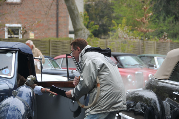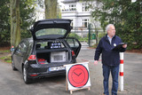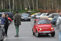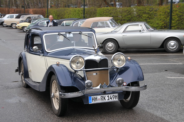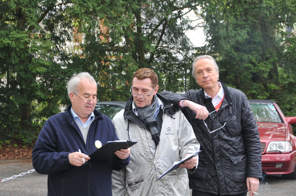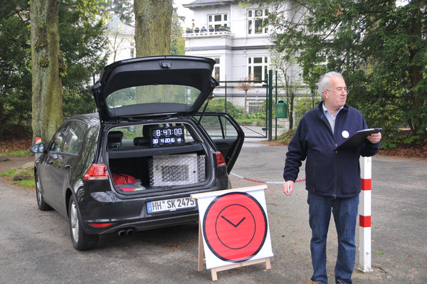 Erstmals, außer bei der von uns organisierten ASC Jahresrallye 2013 auf Sylt, gab es eine Startuhr und es kamen auf der ganzen Strecke FIA-Rallyezeichen zum Einsatz. Gegen 8:30 Uhr machten sich die ersten Teilnehmer von selbst auf in Richtung Parkplatz. Um 08:45 Uhr sollte das erste Fahrzeug starten. Dieses und die folgenden Fahrzeuge rollten bereits wenige Minuten vorher in Richtung Start. Hier galt es, bereits die erste Wertungsprüfung zu absolvieren. Gezeigt wurde ein historisches Lenkrad eines MG´s dessen Umfang zu schätzen war. Hierbei offenbarte sich, dass die Schulzeit schon sehr lange her ist, da Umfang, Durchmesser und Radius für viele quasi ein und dasselbe sind, was sich in der Ergebnissen wiederspiegelte. Das korrekte Maß belief sich auf 138cm. Von 27 bis 180cm war bei den Antworten alles dabei.