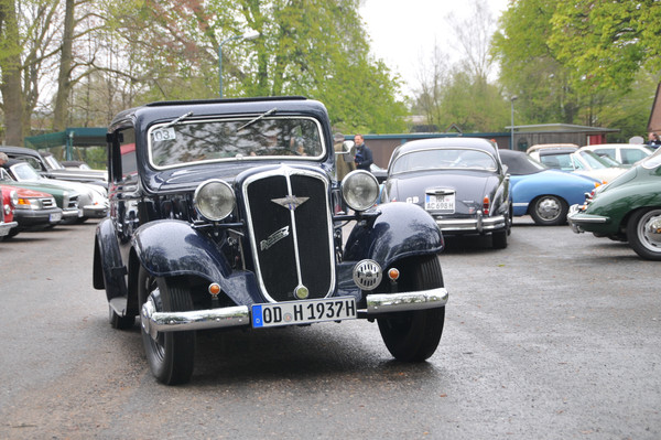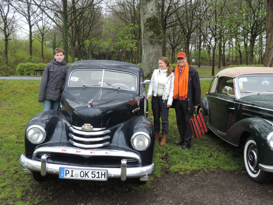 Nun ging es endlich los (mittlerweile hatte es angefangen zu regnen). Entlang der Elbe fuhren die Teilnehmer über Blankenese und Wedel zum Flugplatz Uetersen. Hier waren zwei weitere Wertungsprüfungen zu absolvieren. Gezeigt wurde ein Bild mit 7 der Peanuts Comic-Figuren. 4 waren hiervon namentlich zu nennen. Snoopy und Mr. Brown (der Vorname Charlie war schon schwieriger) waren noch am bekanntesten. Ferner wurde ein Bild des 'Adler Standard 6' von Clärenore Stinnes gezeigt. Nachdem dieses wieder weggenommen wurde, sollte man die Anzahl der Federn des Adlers des Firmenlogos nennen, der oben rechts auf dem Bild abgebildet war. Großes Problem! Es waren 8! Diese Frage konnte nur von 9 Teams korrekt beantworten werden. Den kreativen Antworten waren keine Grenzen gesetzt und mit 1,2 Mio. Federn wurde von einem Teilnehmer die richtige Antwort nur knapp verfehlt.