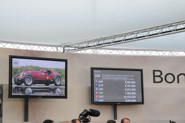 Highlight der Auktion war ein Ex-Scuderia Ferrari ALFA ROMEO 8C-35 Grand Prix Racing Monoposto, der für gut 7 Millionen Euro seinen Eigentümer wechselte. Einen 1931er S-Type Low Chassis Sports Invicta (4,5 Liter) gab es schon für 1,1 Millionen Euro. Es geht aber auch deutlich günstiger. Einen 1944er Willy´s Jeep gab es bereits für € 22.000. Eine 1963er Riva Florida wechselte für 48.000 Euro Ihren Eigentümer.