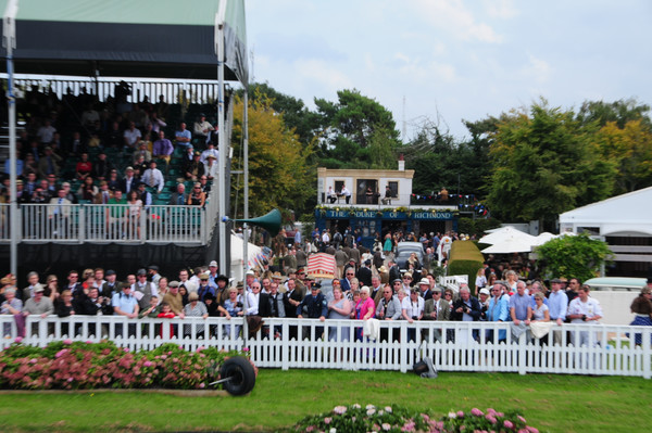 von einem weißen Holzzaun liegen, hinter dem diverse Zuschauer