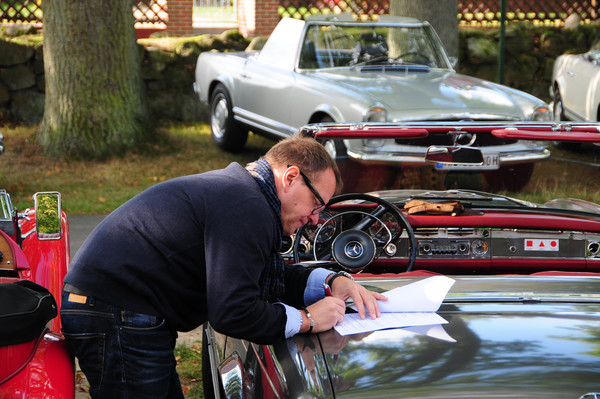 Während des Frühstücks im Hotel Lindtner in Harburg war bereits die erste Prüfung zu absolvieren. Jedes Team erhielt einen Führerschein-Prüfungsbogen. Zur großen Enttäuschung vieler Teilnehmer waren alle Bögen unterschiedlich. Mancher Fahrer mag gedacht haben, 'früher war doch alles besser und die Fragen einfacher' und hat den Fragebogen an die oder den Beifahrer weitergereicht, nach dem Motto, 'ich habe meine Lesebrille vergessen!' Dennoch dachten anfangs noch viele, dass das Ausfüllen und 'Bestehen' der Prüfung kein Problem sei.