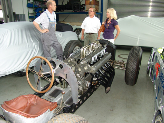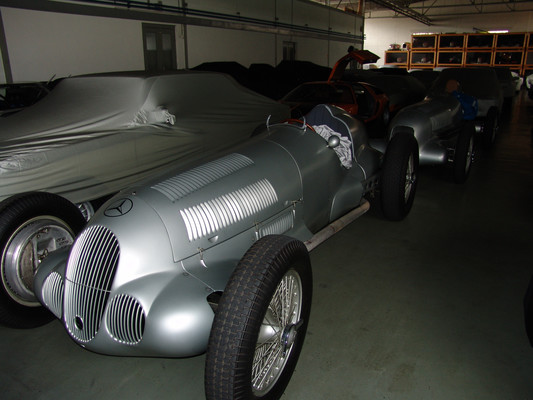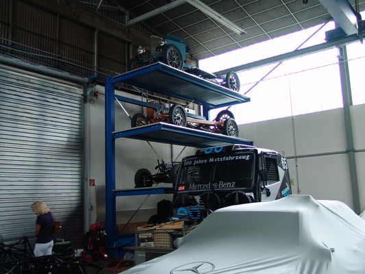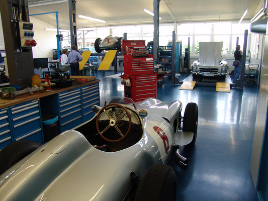 Vom Showroom aus ging es in die Werkstatt, wo sich noch ein weiterer Mitarbeiter des Classic Center unserer annahm. Hier konnten wir dann einen Blick auf Restaurierungsarbeiten an diversen Rennwagen aus der Kompressor-Ära, als auch den 50er und 60er Jahren sowie einer Handvoll 600er der W100 Serie, werfen.
