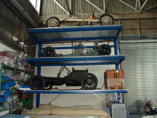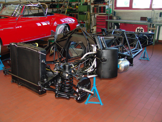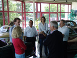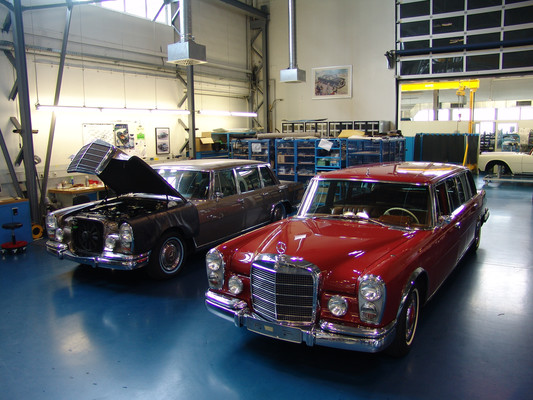 In der Werkstatt zeigten sich uns diverse 600er (kurz, lang, Landaulet, gepanzert etc.), 190SL, 300S, 300SC, 300SL, 280SL etc., die sich in unterschiedlich fortgeschrittenen Restaurierungsstadien befanden. In Sattlerei und Blechnerei konnten wir uns die Arbeiten an Kundenfahrzeugen im Detail ansehen.