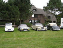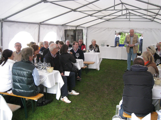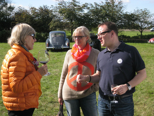 Denn um 12 Uhr erwartete uns hier als totale Überraschung das unvergessliche Highlight der Sylt Revival Tour 2013. In Morsum zeigten uns schon unsere neuen ASC Fahnen und große ASC-Schilder den Weg zu dem Anwesen unserer Gastgeber, unseren Schnauferlfreunden Evelyn und Peter A., die unsere Autos vor ein weißes Festzelt dirigierten. Die Tische waren mit feinem weißen Tuch eingedeckt. Vor jeweils vier Gläsern (!) lag Silberbesteck für 6 Gänge (!). Eine Crew von 12 Personen (!) umsorgte uns nun vom Allerfeinsten, um die Gaumen mit den im Nebenzelt von dem Sternekoch Holger Bodendorf vom Landhaus Stricker frisch zubereiteten Köstlichkeiten und den dazu passenden Weinen bester Lagen zu umschmeicheln. Mit dieser großartigen und großzügigen Überraschung hatte niemand gerechnet. Der Applaus für dieses Erlebnis war riesig. Insbesondere das vorzügliche Indonesische „Laksa“ mit Steinbutt hatte zur Folge, dass das Kochbuch des Herrn Bodendorf am Ende reißenden Absatz fand. Unseren Gastgebern sei hiermit noch einmal tausend Dank zugerufen.